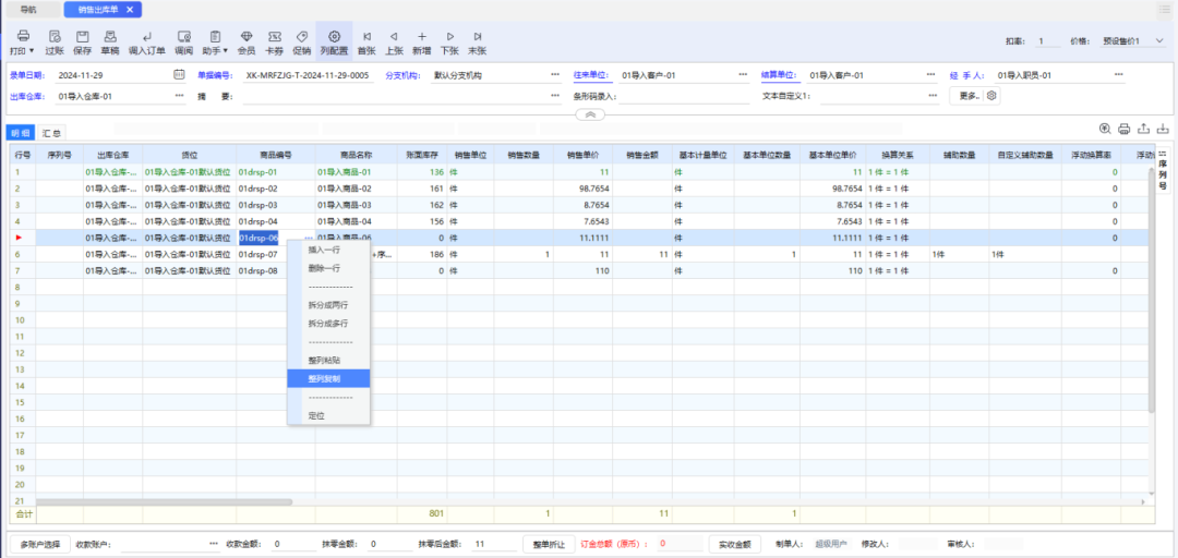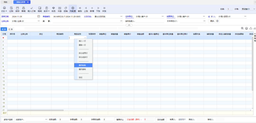 使用"整列粘贴"功能可快速录入数据,支持将复制的整列内容直接粘贴至可编辑单元格,实现批量带出信息,大幅提升录单效率。
