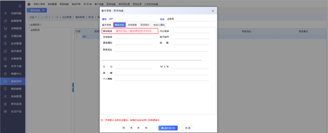 在【基础资料—职员档案】中,为审核人新建一个职员档案,并确保其“移动电话”字段里填写的手机号,与微信扫码绑定的手机号完全一致。