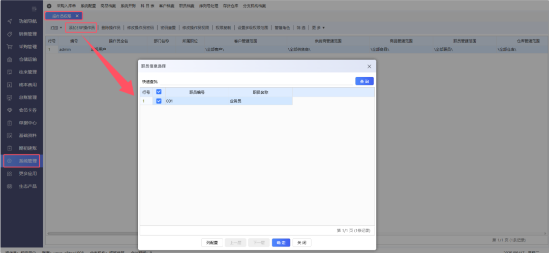 进入【系统管理—操作员权限】,点击【添加ERP操作员】,将之前创建的审核人职员添加为操作员,并为其分配相应权限。
