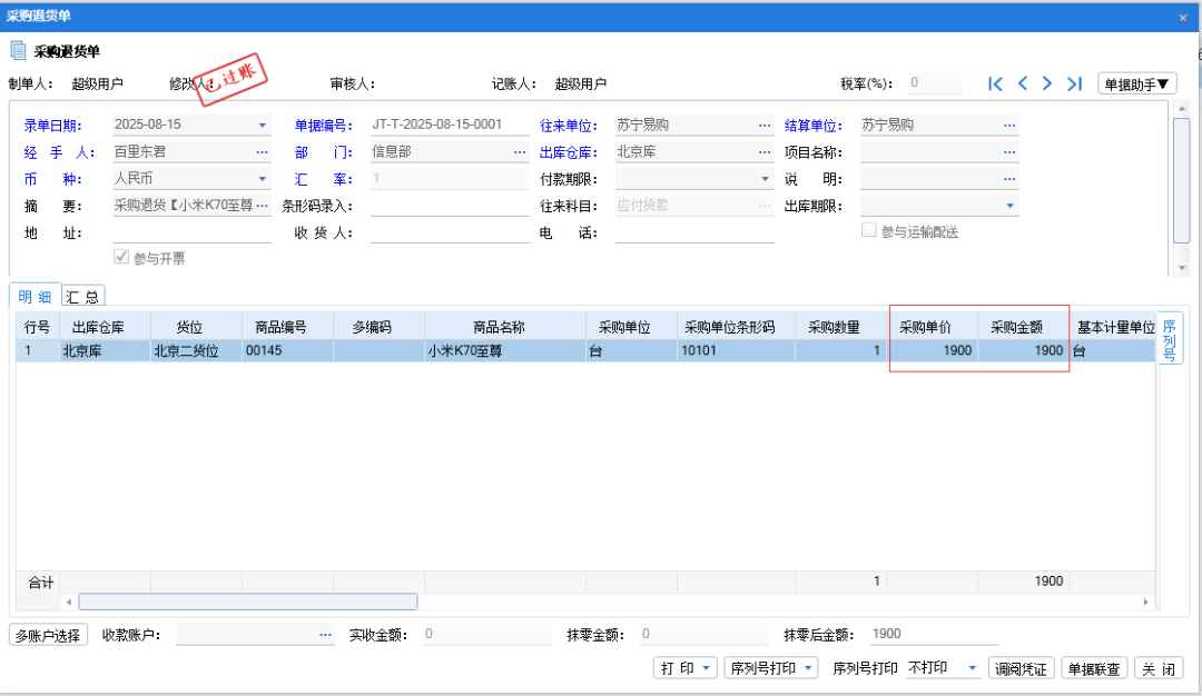 再做采购退货单,退货数量1,单价1900。