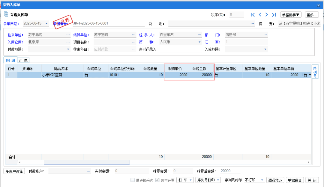 先做采购入库单商品10个,采购单价是2000,采购金额就是20000。