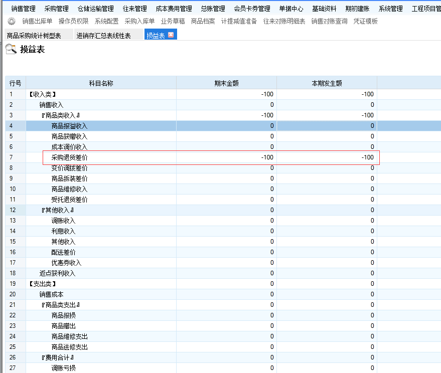 为确保两边报表数据一致,必须保证退货单金额与商品库存成本一致。此外,可通过损益表中的“采购退货差价”项目进行校验:若此项目有金额,则表明退货单金额与库存成本存在差异。
