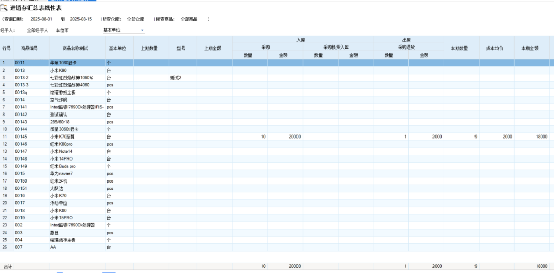 此时,进销存汇总表中采购入库与采购退货的金额分别显示为20000元和2000元,因为该表统计的所有金额均为成本价。