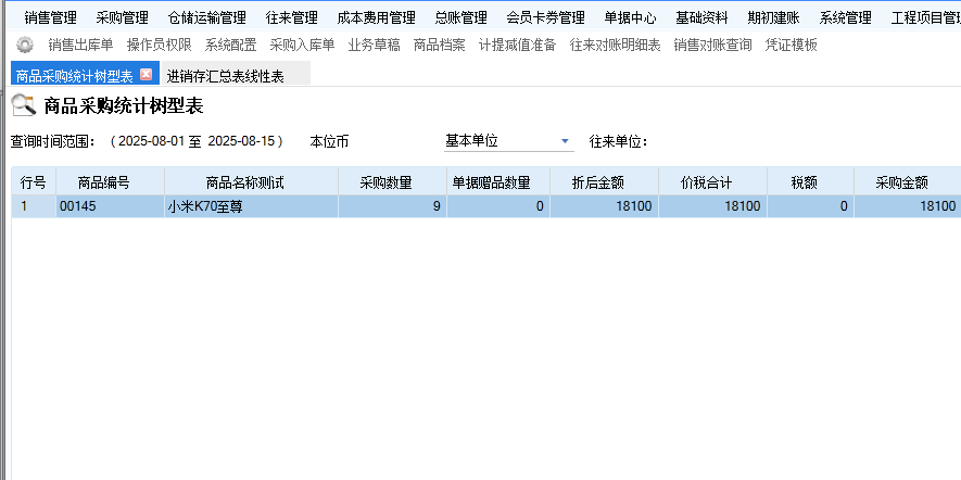 查询商品采购统计的金额为18100元,是由采购入库金额减去采购退货金额得出的,即20000 - 1900 = 18100。