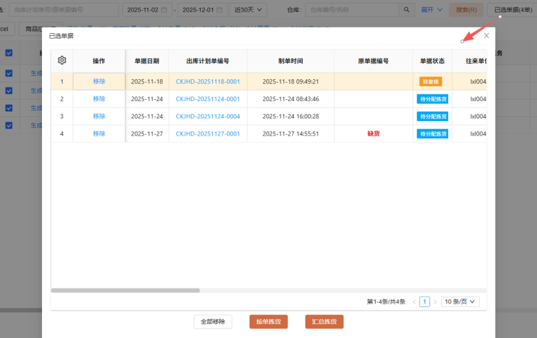 待分配拣货列表,提供已选单据列表,便于记录多次查询结果下的选中单据;可将需要汇总拣货的单据/商品选全后,一次性创建拣货任务。