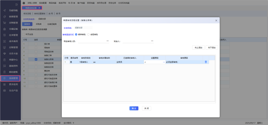 进入【系统管理—操作员权限】,点击【添加ERP操作员】,将之前创建的审核人职员添加为操作员,并为其分配相应权限。